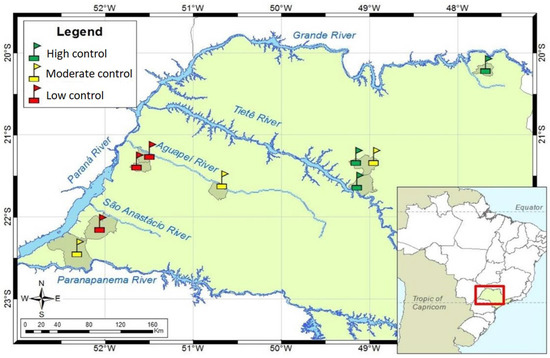 Location of the lambari aquaculture farms studied in the present work. High, moderate, and low control means a decreasing classification in the level of technification. The shadowed areas around the farms are the municipality areas.
