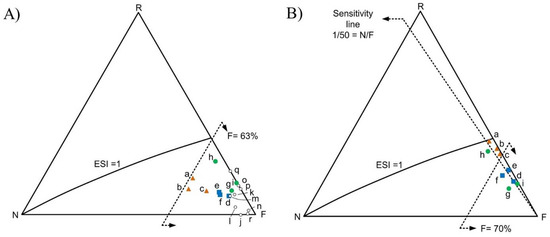 (A) Ternary emergy diagram representing the proportions of renewable resources (R), non-renewable resources (N) and resources from the economy (F). Evaluated lambari aquaculture systems in the present study were represented by ▲ (Low Control—LC), ● (Moderate Control—MC), and ■ (High Control—HC); data from literature were represented by ○. The numbers 1, 2, and 3 represent the three farms of the same control level. ESI = emergy sustainability index. a = LC1; b = LC2; c = LC2; d = MC1; e = MC2; f = MC3; g = HC1; h = HC2; i = HC3; j = recirculating system of Atlantic salmon (Samos alar) aquaculture; k = extensive pond system composed of common carp (Cyprinus carpio), tench (Tinca tinca), roach (Rutilus rutilus), perch (Perca fluviatis), sander (Stizostedion lucioperca) and pike (Esox lucius); l = semi-extensive system of common carp, tench, roach, perch and pike from Wilfart et al. [7]; m = integrated pig-grains-fish (species information unavailable) culture; n = semi-intensive fish (species information unavailable) pond system from Cavalett et al. [24]; o = semi-intensive fish (species information unavailable) pond from Cheng et al. [34]; p = net-cage intensive system of tilapia (Oreochromis niloticus) aquaculture and q = net-cage intensive system of tilapia (Oreochromis niloticus) + bamboo substrate, both from David et al. [35]; r = intensive pond system of carp (grass, silver and spotted silver carp) from Zhang et al. [25]. (B) Ternary diagram representing the proportions of renewable resources (R), non-renewable resources (N) and resources from economy (F) for lambari aquaculture systems after the simulated scenarios for better management practices. Legend: LC systems (▲); MC systems (■); HC systems (●); ESI = emergy sustainability index. a = LC1′; b = LC2′; c = LC3′; d = MC1′; e = MC2′; f = MC3′; g = HC1′; h = HC2′; i = HC3′.