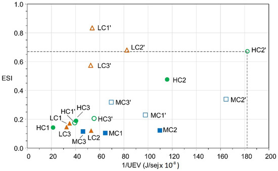 The simulated better scenario resulted in higher performance of the ESIxUEV balance (Figure 5) for all systems. The LC systems achieved the greatest improvement. The system with the higher resilience value, with the larger graphical area for the balance of efficiency and environmental sustainability was the HC2′, followed by LC2′, MC2′, HC2, LC1′, LC3′, MC1′, MC3′, MC2, HC3′, HC3, HC1′, MC1, LC2, LC1, MC3, LC3, HC1 in a hierarchical order.