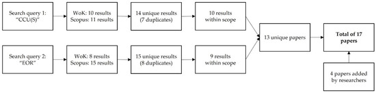 Next, a literature review on the applications of ROT for novel CCU technologies was performed. Literature searches were completed in the Web of Knowledge and Scopus databases to retrieve all papers that performed a real options analysis in a CCU context. The first search query combined different variations of the term “carbon capture and utilization” and the term “real options”. (the first search query was (“carbon capture and utili?ation” OR “CO2 utili?ation” OR “CO2 use” OR “carbon dioxide utili?ation” OR “CCU” OR “CCUS”) AND (“real options”)) These searches in the Web of Knowledge and Scopus database resulted in 10 and 11 papers, respectively. Seven duplicates were identified and removed and four more papers were deleted because they were out of scope (one was a review paper and three other papers were deleted because they only investigated CCS, not CCU). The second search query focused on real options studies for CO2-EOR (the second search query was (“EOR” OR “enhanced oil recovery”) AND (“real options”)). This search query led to 8 and 15 results in the Web of Knowledge and Scopus database, respectively. Of the 23 papers that were retrieved, only nine unique papers were found to fit the scope of this study. Assembling the results from the first and second search query created a literature set of 13 unique studies. Finally, four additional papers that were previously known to the authors for their application of real options in CCU projects were added [17,18,19,20]. The selection of the literature set is shown in Figure 1.