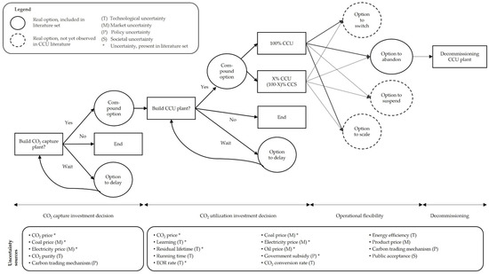 These potential research gaps were filled in by consulting the basic principles from ROT, as summarized in Section 3. Furthermore, lessons can be learnt from ROT applications in other research areas that have tried to fill these gaps before. Finally, the investment decision sequence is presented for CCU projects, incorporating the real options that can be present and summarizing all sources of uncertainty.