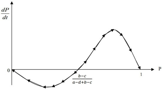Looking from the previous introduction, any stable equilibrium point must be able to keep it steady under the threat of error deviation and other small interferences. That is, when an interference makes P > P*, must be less than 0; when P < P*, must be greater than 0. Letting = , this also means that the derivative () of at the stable point must be less than 0 (the slope of the stable point should be negative). Under the assumption of the above variable value, only () > 0 in three stable states, and according to the stability theorem of differential equations, = is not the stable evolution strategy for this game while = 0 or = 1 is. We use a multiple game phase diagram (Figure 1) to show the above dynamic change process.
