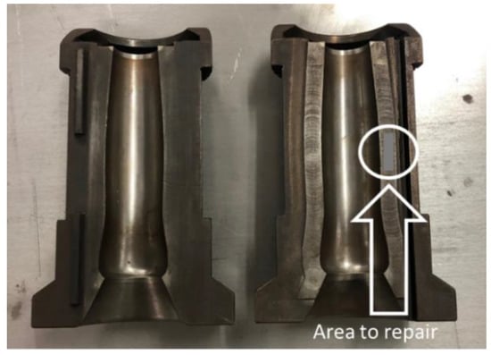 The analyzed case study involved a damaged cast iron mold for glass bottles from an industrial manufacturer (Figure 1). The main purpose of the LCA and LCC study is to analyze the performance of a hybrid manufacturing process (combination of subtractive and additive manufacturing) for the repairing of the damaged mold, in order to extend its lifetime and avoid the consumption of resources to produce a new mold.