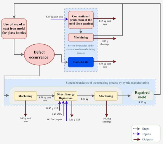 The LCA and LCC study intended to identify and quantify the main environmental and economic hotspots (respectively) of the repairing process, as well as compare the hybrid manufacturing with a conventional BAU scenario—discarding and production of a new mold by sand casting, with a final machining. The hybrid process involves three steps: initial machining of the damaged area, deposition of material with DED technology and final machining to obtain the desired features. The system boundaries of the environmental and the economic analysis are presented in Figure 2.