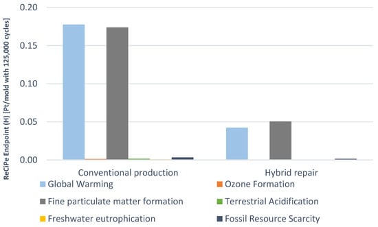 Environmental impact comparison between the conventional production and the hybrid repairing system, expressed in Ecopoints (Pt) through ReCiPe Endpoint (H) per functional unit—one functional mold with a durability of 125,000 cycles.