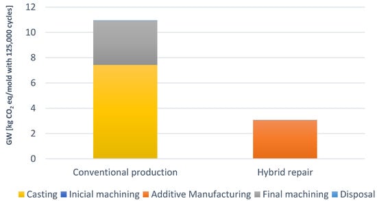 The difference between the conventional and the hybrid repair is 76% in GW and 71% in PMF, indicating that there is a strong potential to reduce the environmental impacts by using this technology, together with the benefits of avoiding the consumption of more resources by extending the lifetime of the mold. Since GW and PMF are the most relevant category for this analysis, a more detailed examination into each process step within the scenarios revealed that the main sources of impact in both categories are the same—combustion of fossil fuel for the generation of energy and electricity to be consumed during the production of the process flows. For that, a more specific analysis was conducted on GW through ReCiPe Midpoint (H) as this is the most relevant category identified in the literature analysis (Table 4). Figure 4 presents the carbon footprint for each scenario per functional unit.