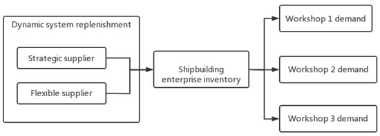 Shipbuilding companies choose more suppliers, which can generally be divided into two types: strategic suppliers and flexible suppliers. Strategic suppliers are suitable for mass production, with high production setup costs, low single product prices, and long order lead times; flexible suppliers are suitable for flexible small batch production, with low production setup costs, high prices for individual products, and relatively long order lead times. Therefore, consider a two-level supply chain consisting of a strategic supplier, a flexible supplier, and a shipbuilding company. The dynamic replenishment structure is shown in Figure 1.