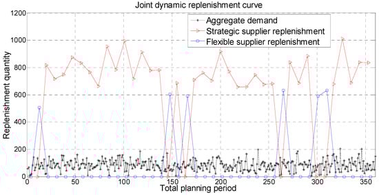 Dynamic coordinated replenishment strategy: At the beginning of time , the shipbuilding company determines the dynamic coordinated order quantity to be issued to two suppliers at the beginning of based on the current inventory and forecasted consumption in the next cycle. The replenishment strategy is determined with the goal of minimizing the total cost of the shipbuilding enterprise in the next cycle.