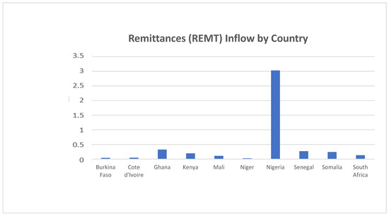 Similarly, among the selected Sub-Saharan African countries, Nigeria is the highest recipient of remittance inflows as shown in the scale of 3.5% in the vertical axis of Figure 2. Nigeria received 3% of the remittance inflow of these selected Sub-Saharan African countries, which is in line with the reported results by [6,12], followed by Ghana at 0.8%, Senegal at 0.7%, Kenya at 0.6%, Somalia at 0.5%, Mali at 0.3%, and South Africa at 0.2%, approximately. Countries with the lowest remittance inflow include Niger, Côte d’Ivoire, and Burkina Faso as depicted in Figure 2.