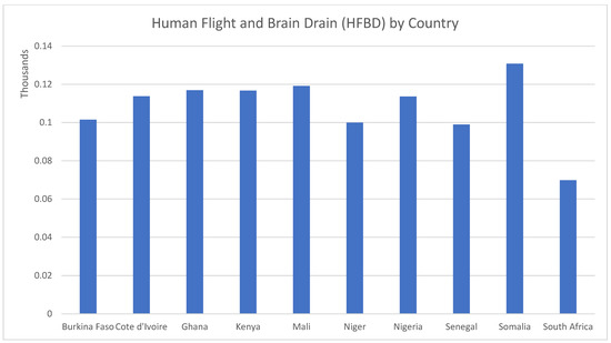 International migration has attracted much attention in recent decades: The large inflow of Eastern Europeans toward Western Europe (about 20 million in the last 25 years); the continuous migration from Latin American countries mainly to the United States; and, in the last couple of years, the surge of refugees moving to Europe that has resulted in the ongoing refugee crisis. From Figure 3, one can observe the country that suffers the most in terms of human flight and brain drain is Somalia, which accounted for an annual outflow of more than 1300 migrants, followed by Mali with 1300, Ghana with 1200, Kenya with 1200, Cote d’Ivoire with 1150, and Nigeria with 1100, approximately. Meanwhile, South Africa is the country that suffers least from human capital flight and brain drain, with an outflow of approximately 700 migrants annually.
