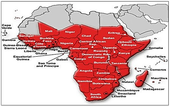 Map of Sub-Saharan Africa as the area of a study showing 54 countries. (Source: http://greatlakesvoice.com/one-in-every-nine-children-in-sub-saharan-africa-dies-before-age-of-5-study/ (accessed on 8 December 2021).