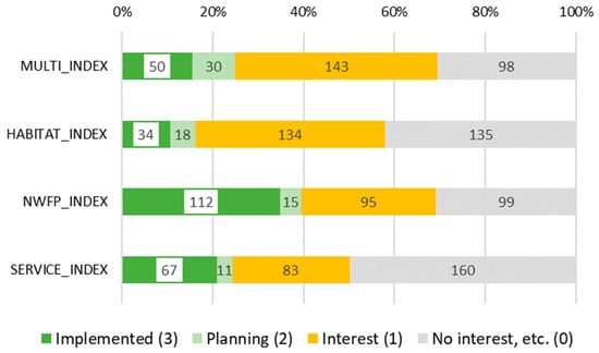 Figure 1 represents the distributions of the four specific innovativeness indices. MULTI_INDEX, HABITAT_INDEX, NWFP_INDEX, and SERVICE_INDEX represent the innovativeness indices for (i) payment for the multifunctional aspects of the forest, (ii) payments for habitat preservation in their forests, (iii) NWFP and biomass energy projects, and (iv) services involving the use of forest environments, respectively. Approximately 50–70% of the respondents have an interest in these measures or have planned for or implemented them. The largest response categories are “having no interest” and “having an interest”, except for NWFP_INDEX where “implemented” is the largest. Approximately 10 (HABITAT_INDEX) to 35% (NWFP_INDEX) have implemented each of these measures.