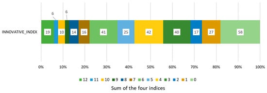 Figure 2 shows the distribution of the general innovativeness index (INNOVATIVE_INDEX), a sum of the four specific indices. This shows that the level of general innovativeness varies widely. More than 80% of the respondents have some interest in at least one of the four measures, as indicated by the fact that less than 20% (=100 − 80) of the respondents scored zero points (no interest in all four measures).