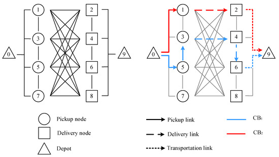 Again, if and only if each trip in a request with multiple trips is served can the passenger be defined as being served effectively. Besides, each CB starts its route from the depot and visits a sequence of nodes to transport passengers. Each visited node () along the route in the constructed request network is recognized by the pickup/delivery node. Although the nodes in the request network have no geographical significance, they are all generated by realistic passenger requests. Therefore, the timetable attribute of each node in the request network corresponds to the following practical features: