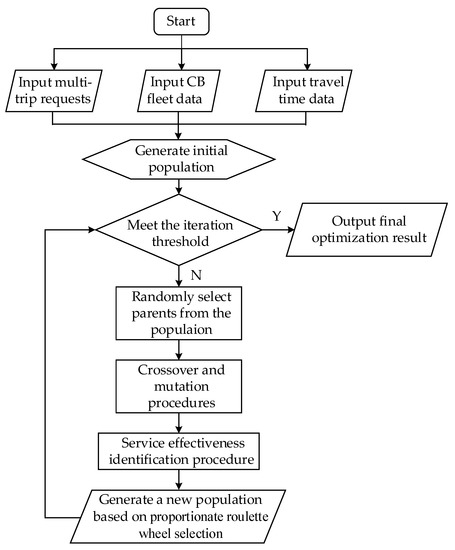 The CB routing problem for the OECBSM-PMT service is a typical NP-hard problem. To ensure the efficiency and accuracy of the calculation, this paper develops a solution algorithm based on the GA, which is an algorithm commonly used to address the routing problem due to its performance in terms of efficiency and flexibility. Meanwhile, considering the characteristics of effective service in the OECBSM-PMT, the algorithm also needs to identify the multiple trips of each passenger to guarantee they can occur with one e-ticket service under the loading and time window constraints. Furthermore, in searching for the optimal solution under the time window constraints, the OTDIH is used in the insertion procedure for efficient and accurate calculations. The basic flow diagram of the algorithm is shown in Figure 3.