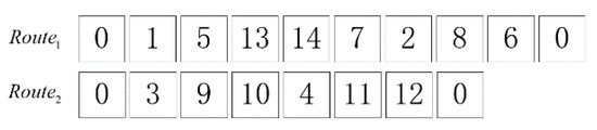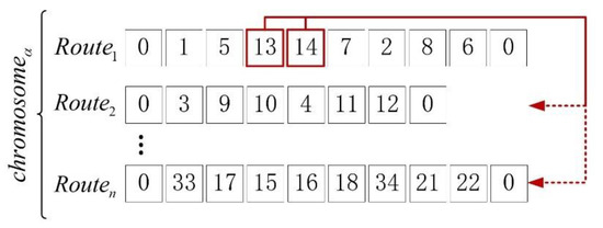 Each solution is represented by the form of the chromosome, which is a permutation of nodes. The solution indicates the order in which the vehicle fleet visits the pickup/delivery nodes and depots. The encoding for the VRPPDTW-based CB routing problem is more complicated, since the chromosome not only needs to represent the sequence visited by the vehicle but also requires the sequence of pickups and deliveries for each request. Considering the above, this study sets the odd number as the pickup node, and as the corresponding delivery node. Meanwhile, node “0” represents the departure and arrival depot. Figure 4 represents the solution under the form of the chromosome, where each route is carried out by a CB.