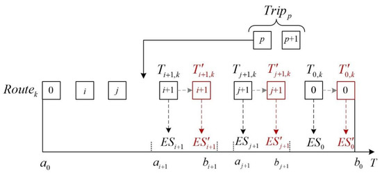 Specifically, inserting a new request into the current route will cause the arrival time of each node after the insert position to change. Considering the possibility that , or may not be in the corresponding time window, it is essential to check the feasibility of the route after the insertion. Let us set up a feasible route as an example. denotes the trip to be inserted into the current route. is the waiting time at node . is the earliest time the vehicle can finish its service at node . is the earliest time the vehicle can arrive at node , and is the latest time the vehicle can arrive at node . The above variables can be illustrated as follows: