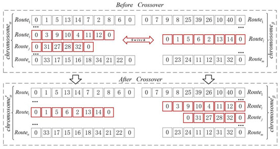 Step 1: Select solutions and from the parent group, and randomly select 1–2 routes from these solutions to exchange, as shown in Figure 6.