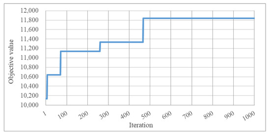 The GA-I algorithm proposed in this paper was able to complete the computation in 6.15 s after 1000 iterations, with crossover parameter and mutation parameter at a population size of 500. The calculation process is shown in Figure 8, where the search achieves a large increase in the objective value in the first 100 iterations, and then the optimization nearly converges to 11,842 after approximately 500 iterations. The result shows that the algorithm is able to achieve optimization within an acceptable computational time and obtains the optimal solution efficiently.