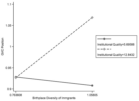To further investigate the interaction effect of immigrant diversity and the institutional quality on the GVC position of destination countries, we conducted a simple test to obtain the conditional slope of the focal predictor, immigrant diversity. As shown in Figure 1, when the institutional quality was low (i.e., two standard deviations below the mean), immigrant diversity was negatively associated with GVC position. However, when the institutional quality was high (i.e., two standard deviations above the mean), immigrant diversity was positively related to the GVC position. This result re-confirmed our empirical finding that the impact of immigrant diversity on the GVC position varies with the institutional quality of destination countries. Specifically, in countries with higher institutional quality, the capability pool effect of immigrant diversity more than offsets the negative social conflict effect. Hence, immigrant diversity improves the GVC position of destination countries. By contrast, in countries with lower institutional quality, the negative social conflict effect is stronger than the positive capability pool effect. Hence, the overall immigrant diversity effect on the GVC position is negative. This result is highly consistent with the hypothesis presented in Section 2.