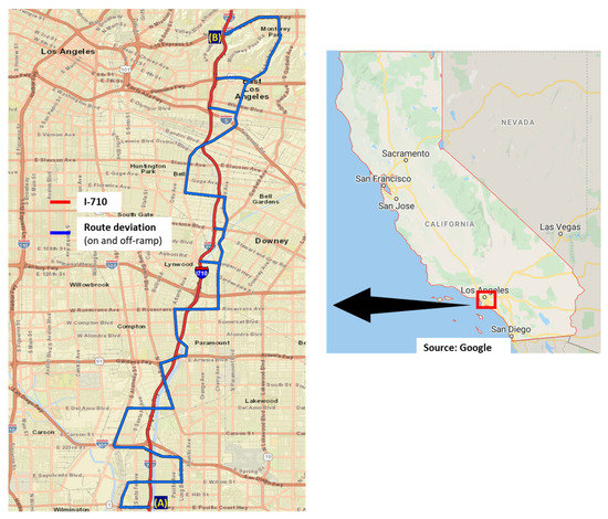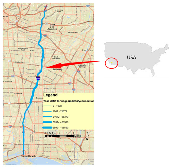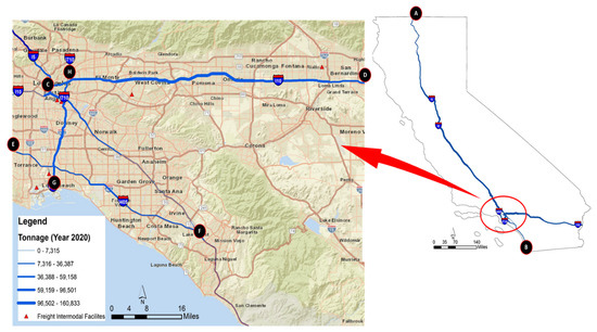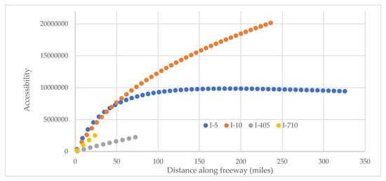 The application of accessibility formulation developed in Equation (9) is shown with the four major interstates/freeways of I-5, I-10, I-405, and I-710 that are prominent truck routes of the Southern California Region. These interstates facilitate the movement of goods and containers to/from intermodal freight facilities and the Port of Long Beach/Los Angeles, CA, USA, of the Region. The spatial locations of the interstates are shown in the map of Figure 11 (Data Source: Caltrans GIS [36]).