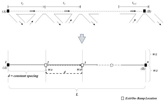 For simplification purposes, the sketch of Figure 2 also shows the location of n ramps with a rectangular area, length, L, and width, W, divided into (n − 1) partitions (each with width W and having a constant spacing d between two exit ramps).