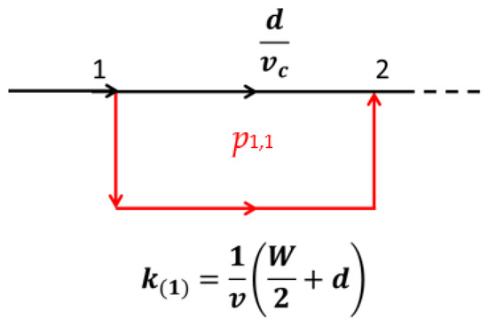 We also define k = average truck travel time from exit ramp on to next immediate downstream on-ramp joining to the freeway, as observed in Figure 3. The derivation of k(1), which stands for k when 1 congested link on the freeway is skipped, follows from the rectilinear approximation of travel to the closest average point located at distance (W/4) in the area adjoining the exit ramp 1 and traveling distance d to the closest downstream on-ramp 2 connecting to the freeway or original path. Thus, , with v being the average speed of the truck traveling from any exit ramp to the immediate next on-ramp. Similarly to k(1), k(2) and k(3) are derived and represented in the sketches of Figure 3, Figure 4 and Figure 5. It can be observed that the feasibilities for k(2) and k(3) are possible only with n ≥ 2. Thus, by generalizing, we have the expression for .
