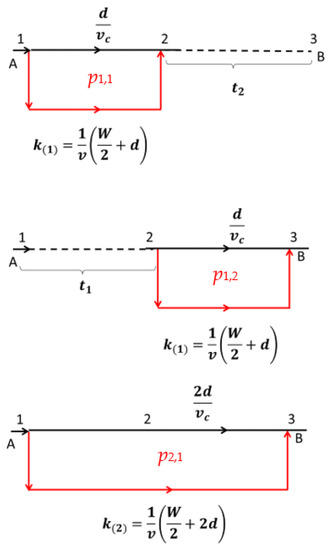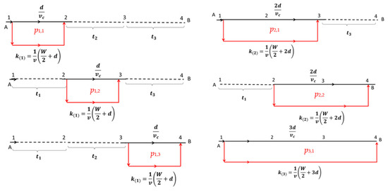 With the above simplification, the expected travel time, E[Tn], as impedance, for n number of ramps from (A) to (B) of Figure 2 is expressed as follows (see Appendix A.1 for detailed derivation):