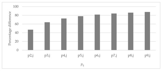 Percentage difference between p1,j and pi,j with i > 1.