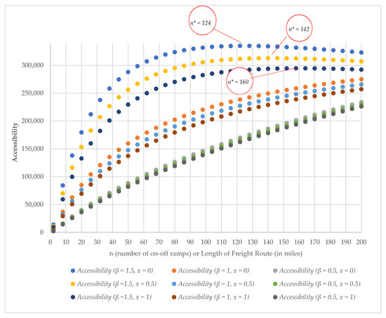 Optimizing accessibility in Equation (9) is possible by realizing that while increase in number of ramp exits, n, would result in an increase in distance covered for a fixed tonnage of commodities and goods transported from origin to destination, this would also cause an increase in travel time as impedance, resulting in a reduction in accessibility. On the contrary, a low number of exits would mean lesser options available to exit from the freeway, limiting detour options for the freight truck. This would ultimately result in a reduction in accessibility to the destination. Thus, an optimal value for route accessibility would occur for some n. In fact, with the 1st and 2nd derivatives of the accessibility expression in Equation (9), maximum route accessibility with n and decay parameter, β, was observed, as stated in Table 1 (see details of derivation in Appendix A.2 and Appendix A.3). In Table 1, n * represents the optimal n. For all β < 1, accessibility is a monotonically increasing function.