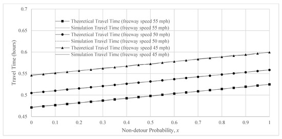 The chart in Figure 10 shows the simulation results compared with the theoretical/analytical outputs for travel time as impedance. The chart shows the average travel time for truck speeds on freeway varying from 45 mph to 55 mph (speed limit for trucks on I-710), along with variable detour probability x that varies from 0 to 1 at an interval of 0.05. With 1000 replications of congestion on one of the links of the freeway, the chart shows that average truck travel times using simulations is quite close to that obtained theoretically using Equation (8), i.e., considering route deviations to avoid congestion only on one link of the freeway. With x = 1 (i.e., with no route deviation), the truck travels through the congested link on the freeway. In this case, travel time is approximately 32 min—which was verified to be true for the uncongested travel time on I-710 using Google Maps historical travel time data for vehicles on a typical weekday.