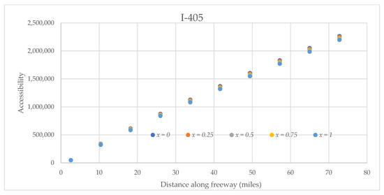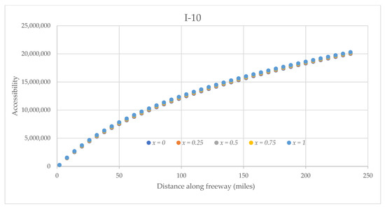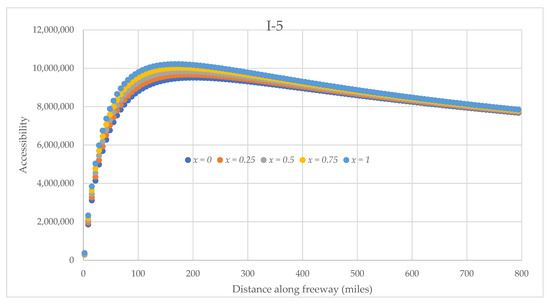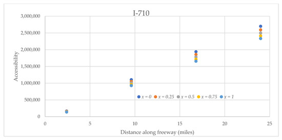 Various detour/non-detour probabilities impact the accessibility of the four interstates for truck platoon differently, as observed in Figure 12, Figure 13, Figure 14 and Figure 15. The accessibilities of the interstates I-5 and I-10 increase with an increase in non-detour probabilities, i.e., (1 − x). On the other hand, for both I-405 and I-710, accessibilities decrease with an increase in non-detour probabilities. These observations could result from the impacts combined due to the magnitude of tonnage, decay parameters, and the average route deviations considered.