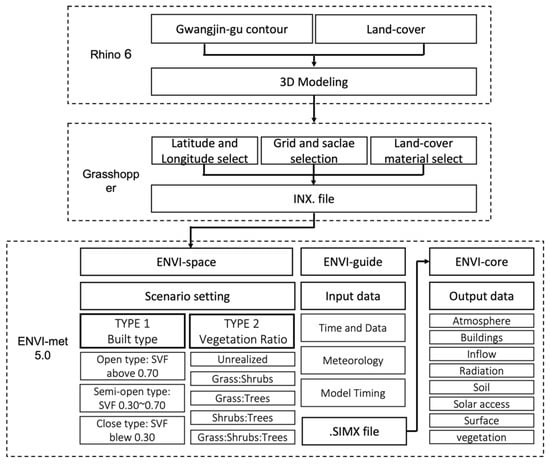 Work flow of 3D modeling using Rhino 6, Grasshopper, and simulation using ENVI-met 5.0.