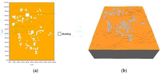 The ENVI-met program “Spaces” was used to convert 2D models of the site into 3D models for thermal comfort analysis (Figure 3). Detailed scenarios were set up and green roofs were designated on a cell-by-cell basis. After that, detailed simulation meteorology was selected using ENVI-guide. Table 2 shows the parameter settings. The simulation date was set to 24 July 2021, when the average temperature was the highest among the temperatures from January to November 2021 [], and a total of 24 hours were simulated from 00:00 to 24:00. Air temperature was set at 17–28 °C, relative humidity at 45–75%, wind speed at 2.00 m/s, wind direction at 87.2°, and roughness length at 0.010. The generated SIMX file was simulated in ENVI-core to derive the final output data.
