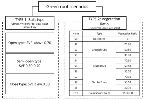 Existing studies simply compare the thermal environmental effects before and after the installation of green roofs. In contrast, this study attempts to derive green roof scenarios that are effective for various urban types. Therefore, after classifying the build type according to the SVF ratio, the scenarios were constructed based on various ratios of grass, shrubs, and trees. The detailed simulation concept is shown in Figure 4. Extreme settings that included one tree with a green coverage rate of 100% were excluded because they were unrealistic, and the final scenarios consisted of 30%, 70%, and 0% green coverage rates. These settings were created in ENVI-space. Table 3 shows the detailed settings of the greenery created in these scenarios. The detailed setting including plant heights for the simulation was set to be an intensive green roof system based on the Ministry of Land, Infrastructure and Transport [].