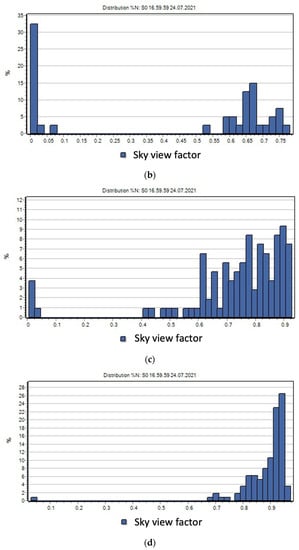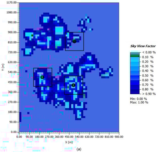 Sky view factor (SVF) ratios for each urban type. Closed area (1), semi-open area (2), open area (3). (a) Analysis of the SVF using ENVI-met. SVF ratios of the (b) closed, (c) semi-open, and (d) open urban types.