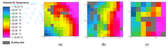 Distribution of the simulated air temperature results for thermal environments in which green roofs were not created (S0). (a) Closed urban area; (b) semi-open area; (c) open area.