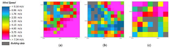 Distribution of the simulated wind speed results for thermal environments in which green roofs were not created (S0). (a) Closed urban area; (b) semi-open area; (c) open area.