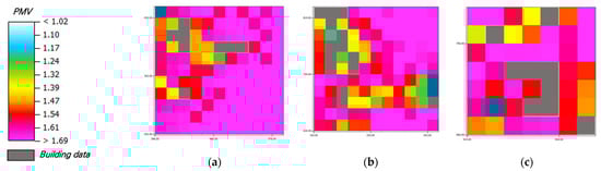 Distribution of the simulated predicted mean vote results for thermal environments in which green roofs were not created (S0). (a) Closed urban area; (b) semi-open area; (c) open area.