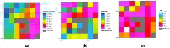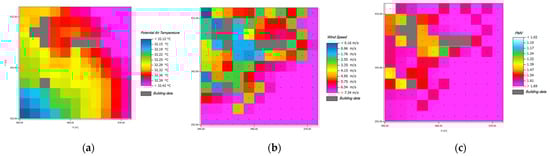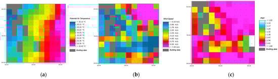 This study conducted simulations on air temperature, wind, and predicted mean vote (PMV) to analyze the thermal environments of the urban types. At this time, PMV is the sense of heat felt by humans in seven stages and is the most commonly used thermal comfort evaluation index thus far []. Table 4 is a reconstruction of the table of Matzarakis et al. [], showing the state of thermal comfort and physiological stress according to the PMV index.