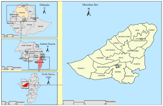 This study focuses on Moretina Jiru Woreda (District), located in the North Shewa Zone of the Amhara Region. The site was randomly selected from among similar cereal and pulse-producing areas in the region. The study site is presented in Figure 1.