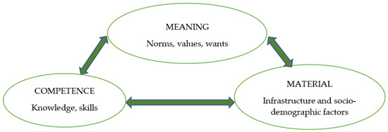 The study used the abovementioned codes under three themes, followed by the Social Practice Theory [30]. According to Braun and Clarke [24] (p. 84), a “theoretical” thematic analysis would tend to be driven by the researcher’s theoretical or analytic interest in the area and is thus more explicitly analyst-driven. With reference to the Social Practice Theory [30], the study has categorized the 14 research codes under three themes entitled “meaning”, “material”, and “competence” (Figure 2).