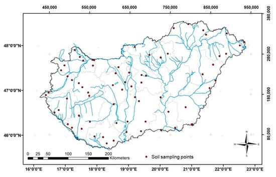 In the summer of 2017, seventy geo-referenced soil samples were collected from the 0–20 cm at sites throughout Hungary (Figure 1). The sites included 59 intensive arable fields, five forests, five grasslands and one horticultural area. The chosen soils were mainly Chernozems, Phaeozems, Cambisols, and Luvisols.