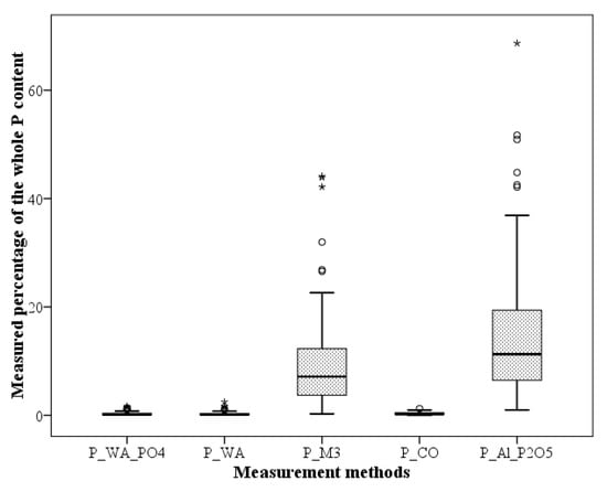 The mean, median, minimum and maximum percentage values stemming from the P determination methods resulted in similarities and differences in the two CaCO3 groups. The order of the measured magnitudes based on the mean in case of <1% CaCO3: CoHex < P-WA(P) < P-WA(PO4) < M3 < AL