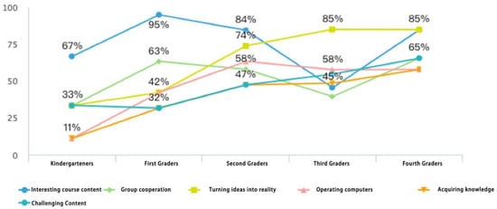 By investigating the students’ motivation to attend the course, the questionnaire results showed that the interesting attribute was the biggest reason attracting students to the 3D cartoon toy design course. After cross-analysis of the data, it was found that lower-grade students had relatively higher demand for experiential learning [30] such as interesting course content and group cooperation. With the increase in students’ grade, their demand for skills such as turning ideas into reality and operating computers and for knowledge such as interesting and more challenging content rose, as shown in Figure 5.