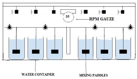 The jar test apparatus (Figure 1) was used to observe the biomass’s effectiveness (Yucca extract and cow dung) with a stirring speed of 35 RPM. The experiments were carried out in triplicate for more precise results. Because of the jar test apparatus’s limitations, the triplicate samples were treated separately because it had only a six-beaker arrangement. The reported results are the final valid values extracted after several experiments under varying experimental conditions. The collected MTSE were taken into the six one-liter beakers.