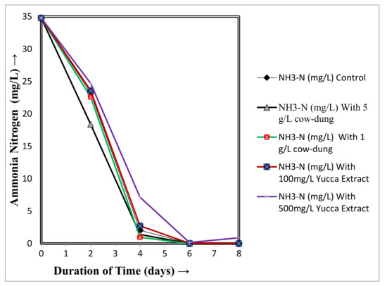 The present studies have been conducted to combat the ammonia nitrogen in the secondary treated municipal sewage water by using a desert plant extract, Yucca schidigera, and cowdung. However, Yucca extract has been reported in some previous studies for its capability of removing ammonia nitrogen from the water [24,25,26,27]. The experimental studies conducted using the cowdung on treated sewage yielded better results for combating the ammonia nitrogen and have shown its potential to be applied in real life for large masses of wastewater. In addition to cowdung, Blue-buck dung and Buffalo dung, both fresh and digested, were also employed for the studies on removing ammonia nitrogen, but the digested cowdung was found to be effective.