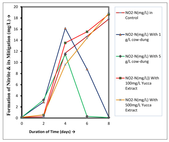 The conversion of ammonia nitrogen into the stable nitrate form is a very typical mechanism. In general practice, the treated effluent’s mechanical stirring oxidizes the ammonia nitrogen to nitrite in the presence of nitrifying bacteria and natural oxidation. However, nitrite is also as harmful as ammonia regarding the production of disinfection by-products. In the present experimental study, the conversion of ammonia nitrogen into nitrite and nitrite into nitrate is simultaneous. However, the cow dung (digested) contributes to adding an insignificantly small amount of ammonia nitrogen to the samples. This negligible amount has not been counted for the sake of convenience. The authors analyzed the exact maximum amount of nitrite and nitrate formation.