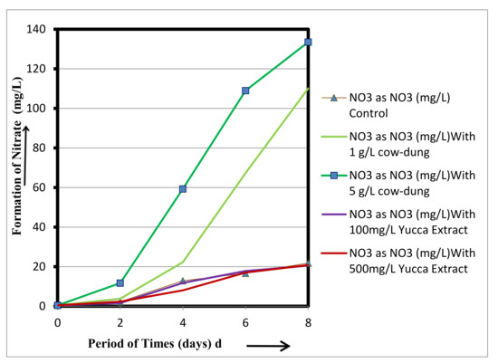 Figure 4. Conversion of ammonia nitrogen into nitrate (in control, with cow dung and Yucca extract).