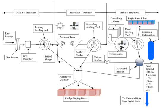 Cow dung is abundantly available in India. Using cow dung as a bio-resource in wastewater treatment plants is safe and environmentally friendly because cow dung and cow urine are used to treat several human diseases in Indian herbal and natural treatment systems [39,40,41]. Activated sludge from the final settling tank has to take to feed the aeration tank. It would be required to maintain a temperature of 32 to 38 °C of the mesophilic temperature range as microbiological activities are more prominent at higher temperatures.